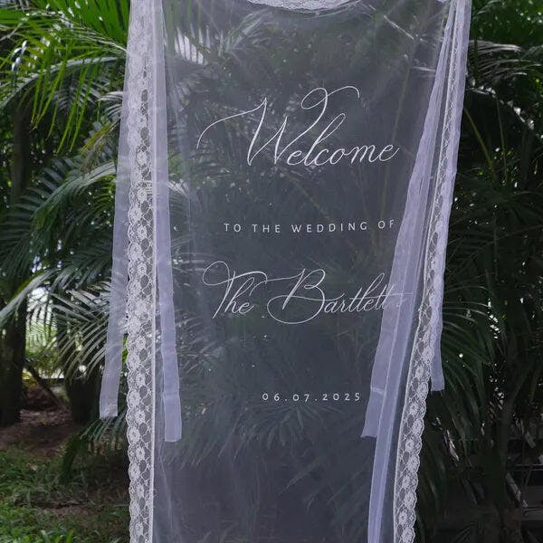 Welcome Fabric Sign, Sheer Sign, Fabric Sign, Wedding Veil, fabric sign, Custom Wedding Welcome Sign, Personalized Lace Edge Sign
