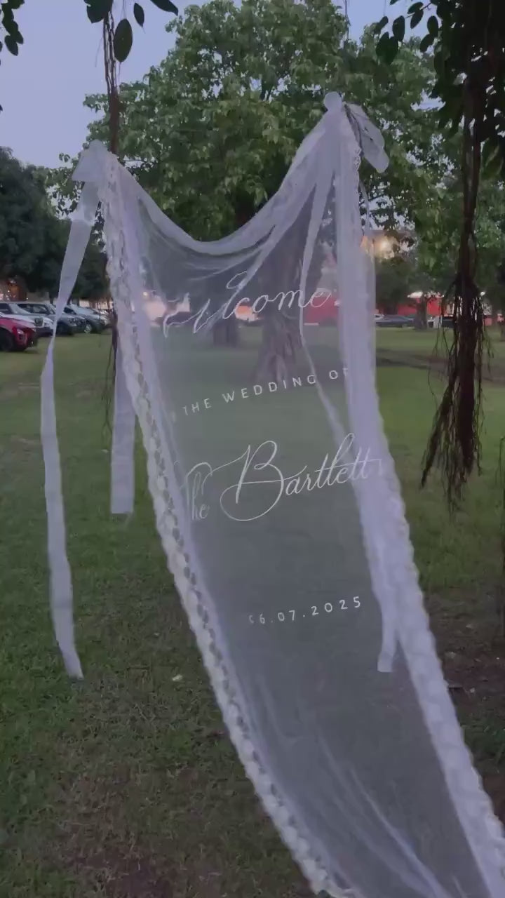 This was the most ethereal and romantic welcome sign I have ever seen. The way it's sheer and flows in the wind is just so dreamy. It made our wedding entrance feel like a fairytale. Absolutely perfect.