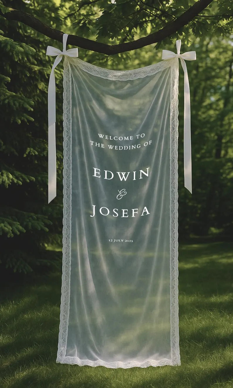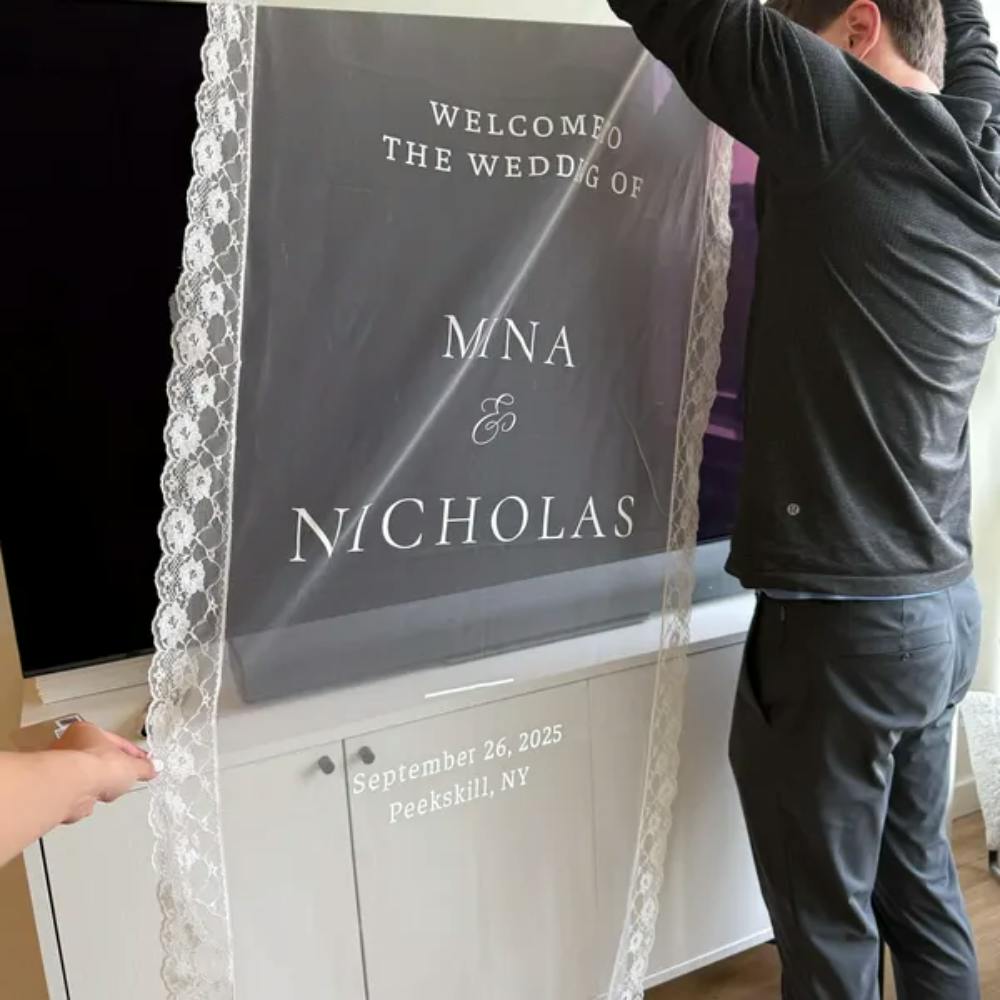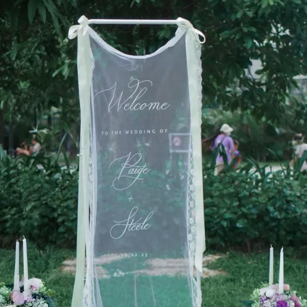 Elegant Wedding Sheer Welcome Sign with Lace Border – Personalized Wedding Entrance Décor